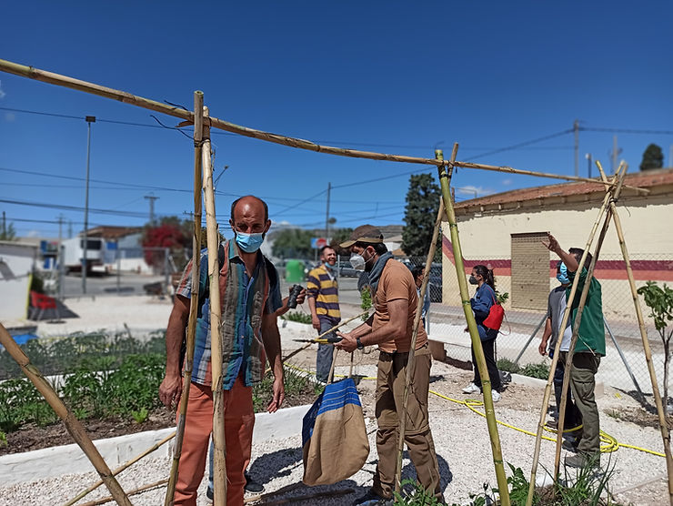 Tras dejar las tomateras listas se empezó con la estructura de cañas. Fue en el tercero de los bancales donde se levantó la primera de las estructuras con ayuda y trabajo de todos los asistentes.