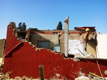OBRAS DE SEGURIDAD EN FACHADA CONLINDANTE, MONTAJE Y REVESTIMIENTO DE BANCOS/JARDINERAS. 2 técnicos trabajos en altura, 4 formadores, 8 voluntarios del barrio (1 realizando trabajos para la comunidad) y 4 voluntarios externos. Total 18p.