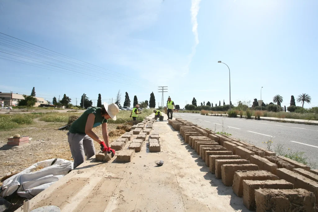 Un taller de bioconstrucción con tierra, paja, madera y cañizo en el que se construyeron, de forma comunitaria, más de 200 adobes tras las pruebas pertinentes de tierra de la zona para conocer las propiedades de la misma.